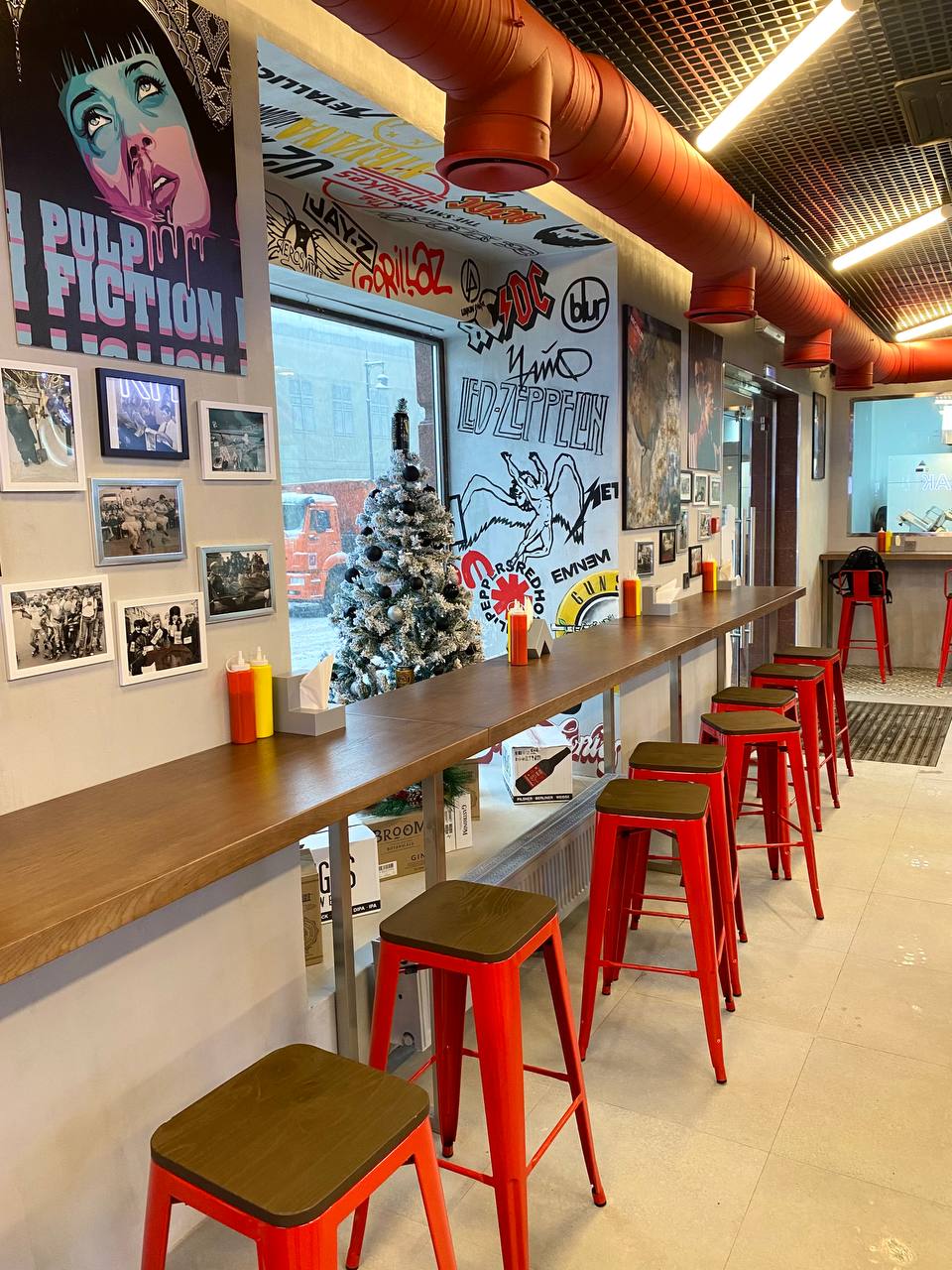 В закусочной открытая кухня, отдельная зона бара. Оформление посвящено музыке и фильмам, которые любит Андрей Шмаков, а это рок и, например, «Криминальное чтиво».