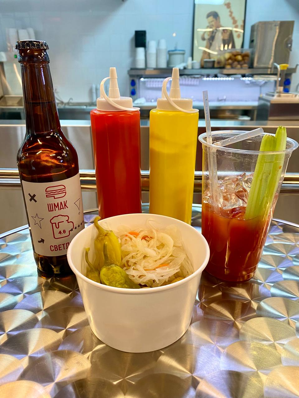 Бутерброд с одним топингом и соусом стоит от 550 руб. (вегетарианский) до 750 руб. (с говядиной). Пиво (три вида) – по 350 руб.