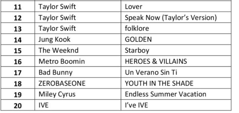 K-pop тут тоже есть: «Golden» Чонгука из BTS на 14-й строчке, «Youth in the Shade» нового бой-бэнда Zerobaseone на 18-й и «I’ve Ive» Ive на 20-й. «Un Verano Sin Ti» Bad Bunny – как и «Midnights» Свифт – попадает в рейтинг второй год подряд.