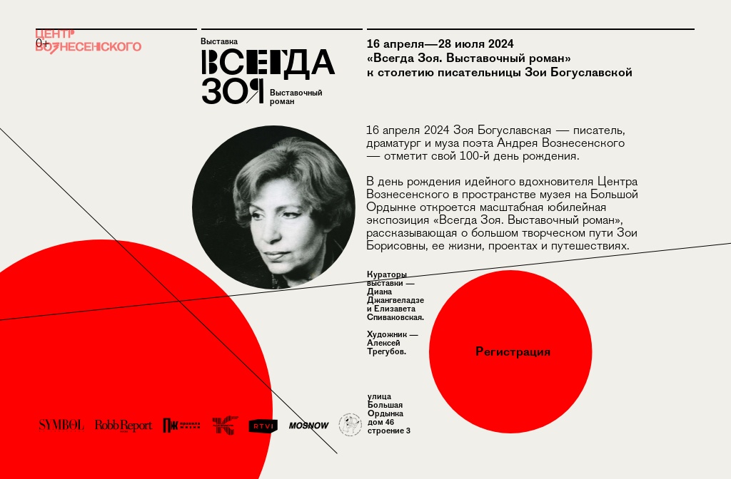 В день рождения идейного вдохновителя Центра Вознесенского в пространстве музея на Большой Ордынке открылась масштабная юбилейная экспозиция «Всегда Зоя. Выставочный роман», рассказывающая о большом творческом пути Зои Борисовны, ее жизни, проектах и путешествиях.