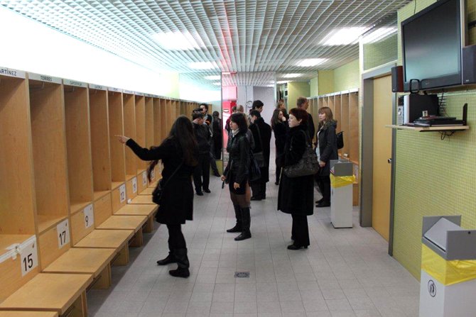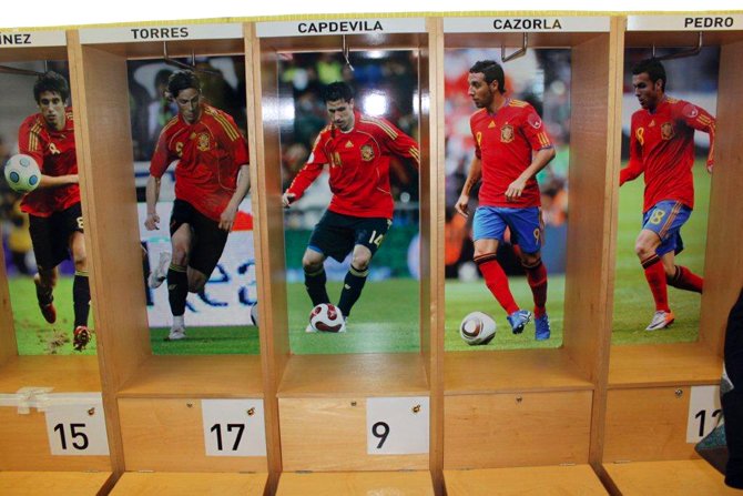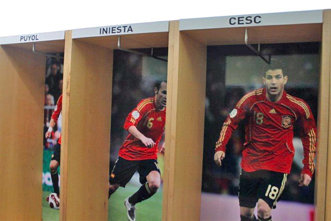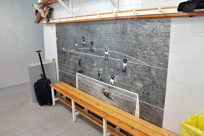 Раздевалка национальной сборной. Тоже, как видите, никакой особой роскоши. В элементах оформления — ни единого отголоска недавних больших побед. Зато имеется огромная, во всю стену, фотография, запечатлевшая гол Переды в ворота Яшина в финале Евро-64. Потом, если кто не помнит, нам забил еще и Марселино, и «золото» того чемпионата стало для сборной Испании первым и на долгие-долгие годы единственным светлым пятном в ее истории.