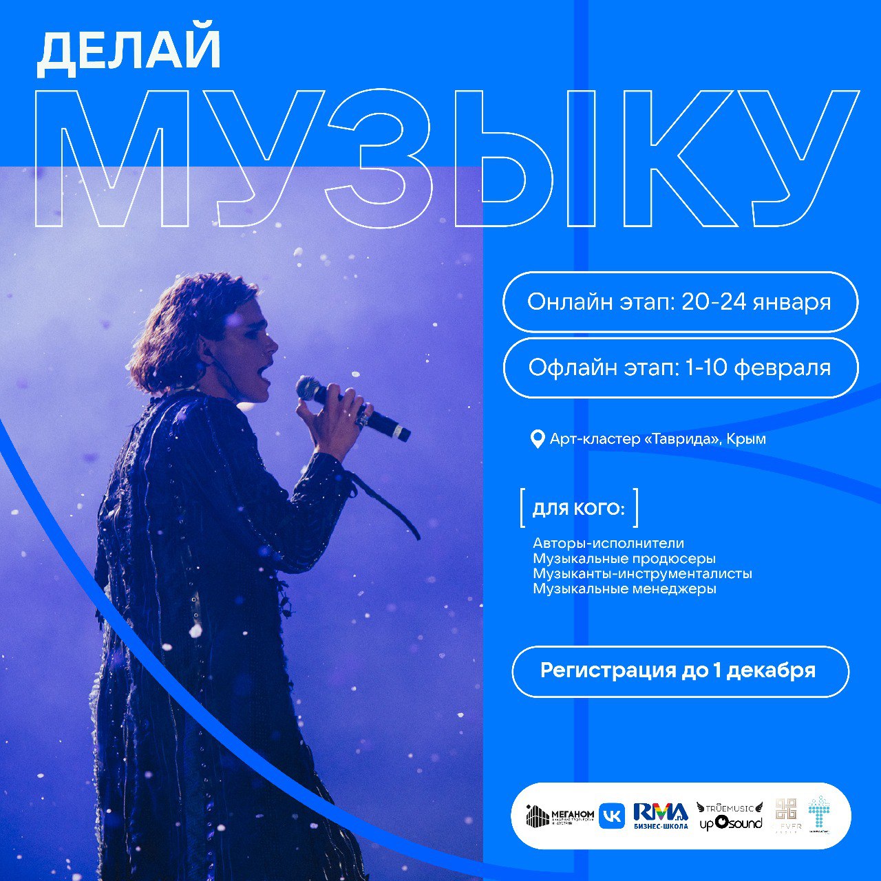 МЕГАакадемия, Академия «Меганом» и Бизнес-школа RMA представляют масштабную образовательную программу «Делай музыку». К участию приглашаются авторы-исполнители, музыкальные продюсеры, музыканты-инструменталисты и музыкальные менеджеры в возрасте от 18 до 35 лет, создающие песни на русском языке в современных жанрах.