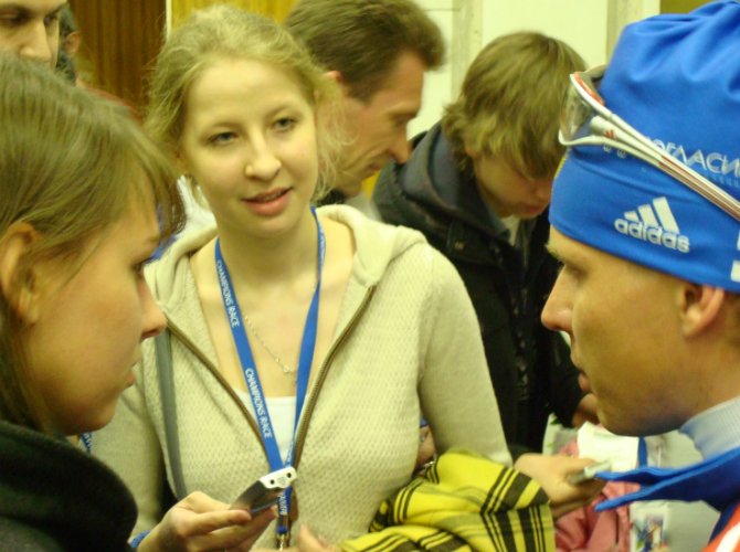 Мы уже сообщали о том, что несколько слушателей программы «Менеджмент в игровых видах спорта» прошли стажировку на биатлонной «Гонке Чемпионов». А сегодня публикуем отчет об этом мероприятии, написанный одной из его участниц, студенткой группы С-23 Мариной Кададовой (на фото – слева, беседует с трехкратным чемпионом мира Иваном Черезовым).