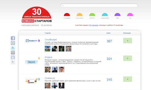Наконец, важным пунктом для попадания в топ-30 стали участие в профильных конференциях и публикации во влиятельных общественных и отраслевых СМИ. Вся информация бралась из открытых источников. Каждый показатель обсчитывался по отдельной формуле, после чего полученные коэффициенты суммировались для определения итогового места стартапа в «табели о рангах». Оценка перспективности самих бизнесов при составлении рейтинга не проводилась.