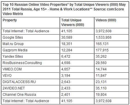 Компания ComScore, предоставляющая исследования онлайн-видео с помощью сервиса Video Metrix, выпустила первый отчет по российскому рынку, опубликовав статистику просмотров за май для 10 популярных видеохостингов. Как отмечают эксперты, давшие комментарии для пресс-релиза компании, с приходом Video Metrix в Россию «стала доступна более полная картина потребления видео в стране». Сам сервис работает уже четвертый год – появившись в США, он уже вышел в Великобританию, Францию, Германию, Италию, Испанию и Турцию, напоминает SeoPro.ru.