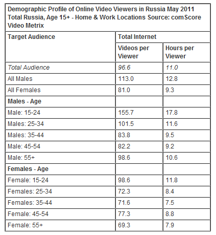 Итак, ролики в сети смотрят 85% пользователей Рунета: в мае на 41 с лишним миллион пользователей пришлось почти 4 миллиарда онлайн-видео. Активнее всего видео потребляют мужчины 15-34 лет (они просматривают от 100 до 150 роликов в месяц, тратя на это от 11 до 18 часов), а также девушки от 15 до 24 лет (под сотню видео общей продолжительностью около 12 часов). Любопытно, что для всех остальных возрастных категорий показатели не отличаются: мужчины старше 35, независимо от того, какой десяток они разменяли, потребляют порядка 80 роликов в месяц; женщины от 24 лет и старше «облюбовали» планку в 70 видео в месяц. При этом средний показатель на человека существенно разнится от хостинга к хостингу.