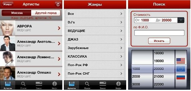 12 июля в онлайн-магазине приложений для платформ Apple – App Store – появилась программа iBooking, созданная для агентства «Империя музыки». Клиент работает на базе смартфона iPhone, планшетника iPad и плеера iPod Touch, и позволяет оставить предзаказ на выступление исполнителя на вашем мероприятии, выбрав его по жанру и размеру гонорара. Приложение уже содержит базу из более чем 500 российских ведущих и артистов и их зарубежных коллег, а также позволяет прикинуть, кого из музыкантов или конферансье можно пригласить за имеющуюся у вас сумму. Менеджменту исполнителей также предлагается разместить своих подопечных в базе, связавшись с представителями «Империи музыки», сообщает портал «Звуки.ру».