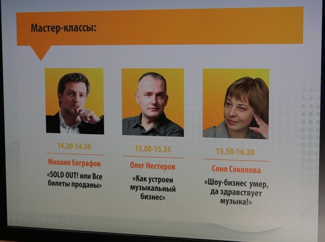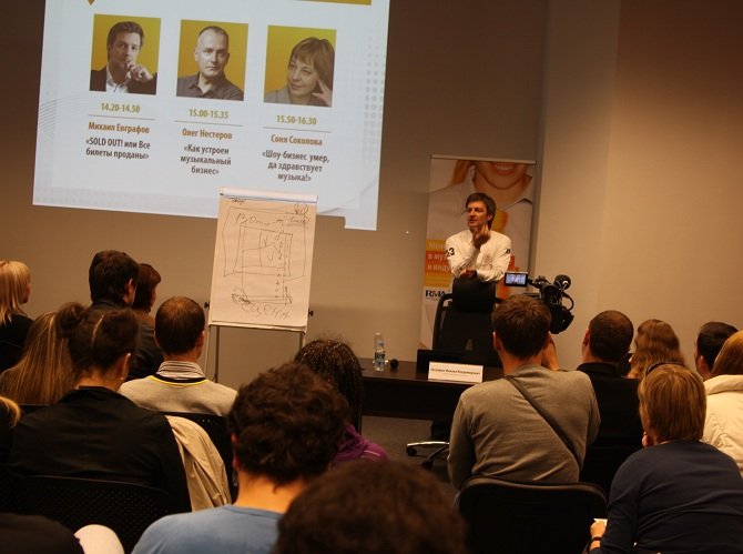 24 сентября в центре Digital October, удачно расположенном на Стрелке рядом с модными столичными клубами, кафе, ресторанами и арт-галереями, прошел День открытых дверей образовательной программы «Менеджмент в музыкальном бизнесе и индустрии развлечений» RMA. Просторная аудитория едва вместила тех, кто решил посвятить субботний день самообразованию и знакомству с лидерами музыкальной индустрии: мастер-классы для собравшихся провели Олег Нестеров («Снегири Records»), Михаил Евграфов («Первый канал») и Соня Соколова («Звуки.ру»). Глава рекорд-лейбла «Снегири» познакомил аудиторию с состоянием современного шоу-бизнеса, а Михаил Евграфов и Соня Соколова «вдались в детали», рассказав о билетной политике и роли Интернет в развитии музыкального бизнеса, соответственно.