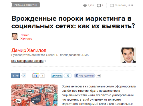 Первым из лекторов-практиков RMA к реализации идеи подключился Дамир Халилов, руководитель SMM-агентства GreenPR, – его колонка о social media marketing открылась 5 октября публикацией «Врожденные пороки маркетинга в социальных сетях: как их выявить?». В дебютной статье на портале Халилов объяснил, почему продвижение в новых медиа подходит не всем, перечислил трудности, с которыми сталкиваются b2b-компании, придя в соцсети, и обозачил четыре критерия, которые помогут бизнесу понять, стоит ли ему возлагать надежды на SMM.
