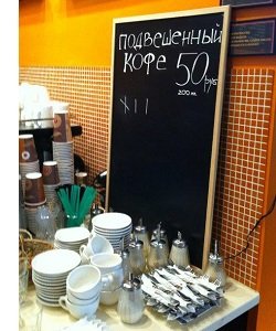 Суть традиции «подвешенного» кофе заключается в следующем: гость заведения покупает несколько чашек кофе (это также могут быть другие напитки и даже блюда), но ему наливают, скажем, только одну – остальные идут нуждающимся. То есть любой необеспеченный человек может зайти в заведение, спросить и получить свою чашечку «подвешенного» кофе, оплаченного за него более состоятельным гостем. Подобная практика благотворительности появилась на Аппенинах не так давно, но уже завоевала популярность у местных жителей, а теперь пришла и в нашу страну.